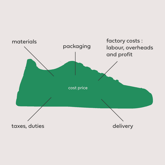 Firstly, there is the 'cost price' - this is what the brand pays to get the shoes made and delivered to their warehouse and includes : materials, packaging, factory costs, taxes, duties and delivery.